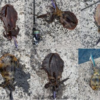 長崎南部のエギングにて1025gのアオリイカを頭に9杯釣れたそうです。紫テープを使用しボトム付近でのヒットが多かったとの事です。上げ潮での釣果です。※画像…