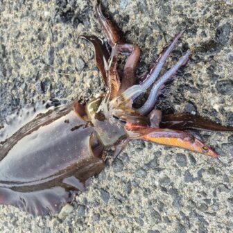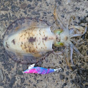 新長崎漁港でのエギングで1.5kgのアオリイカが釣れたそうです。夕方の下げ潮が大きく動く時間帯での釣果です。