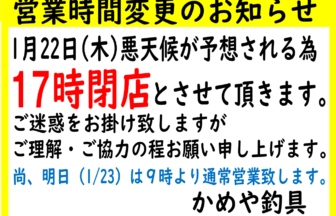 1月22日(木)は17時閉店、23日(金)は朝9時オープンですm(__)m⛄