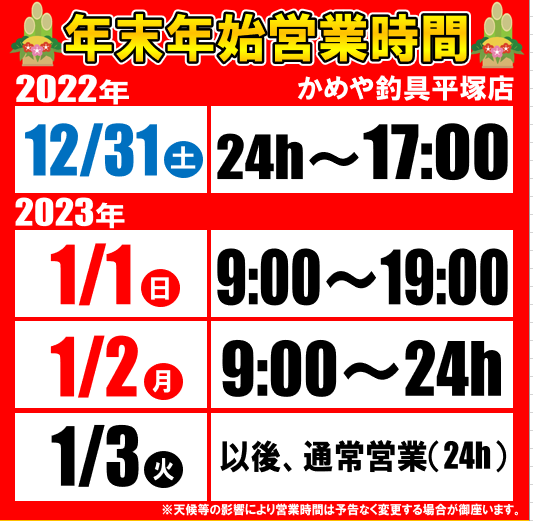 1月2日の9時開店後オールナイト営業となりますので、ご釣行予定を立てられていたお客様には大変ご不便をお掛け致しますが、何卒ご理解頂けます様、お願い申し上げます。