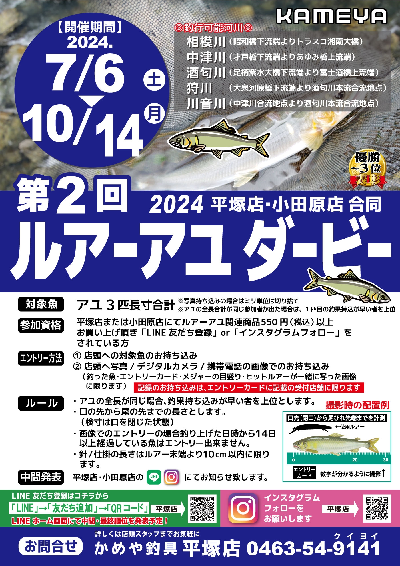 かめや釣具平塚店です🐢7/6(土)より第2回ルアーアユダービーを開催致します!参加資格やエントリー方法、その他ルール等につきましては投稿をご覧ください🎣