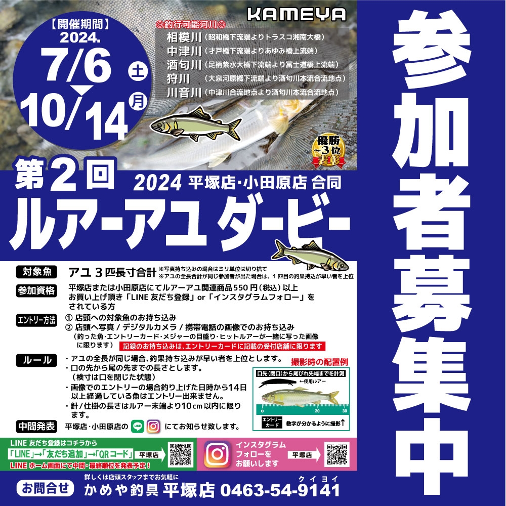 参加条件と致しましては、平塚店・小田原店どちらかで「ルアーアユ用品¥550以上お買い上げ」となります!