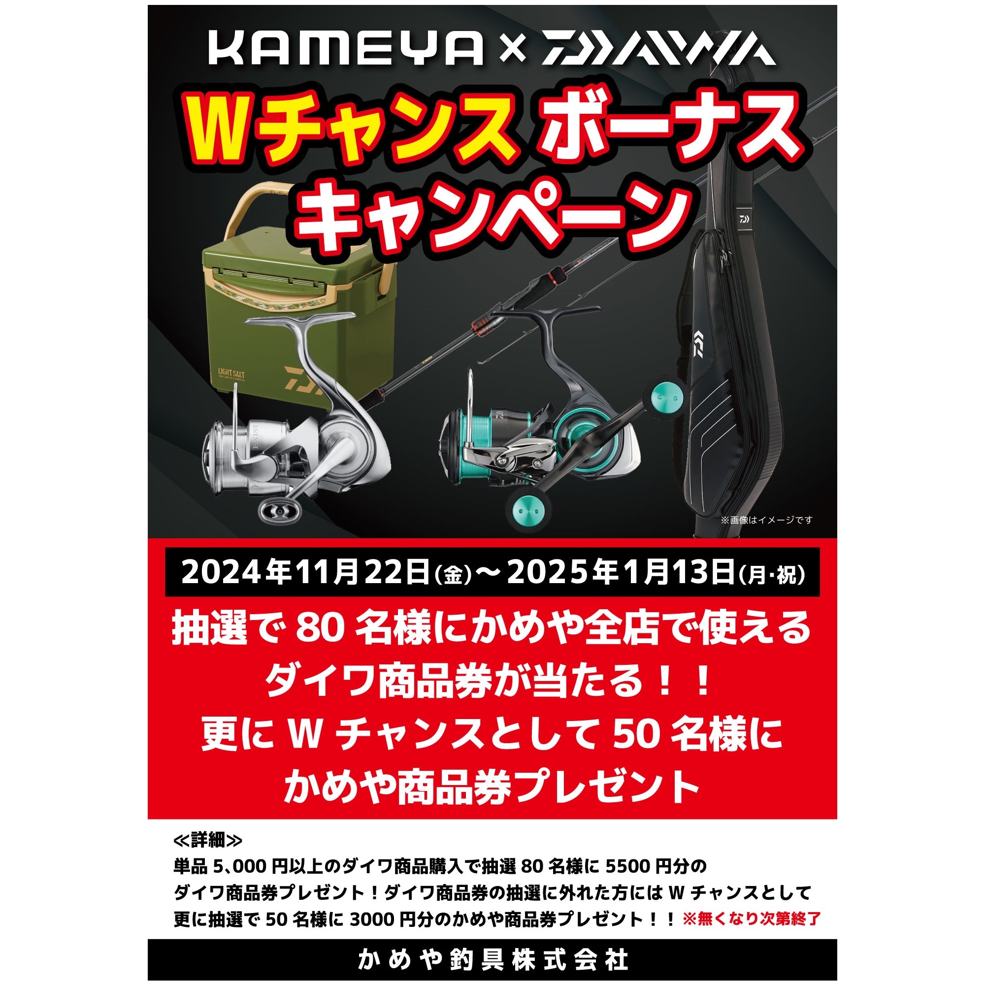 皆さんこんばんは!かめや釣具平塚店です🐢本日、2024年11月22日(金)~2025年1月13日(月)までの間KAMEYA×DAIWA Wチャンスボーナスキャンペーンを実施しております!!単品5000円以上のダイワ商品購入で抽選80名様にかめや全店でお使いになれるダイワ商品券が当たります!!また、Wチャンスとしてダイワ商品券に外れた方抽選50名様にかめや商品券をプレゼント致します。※無くなり次第終了致します。是非、この機会にみなさん足を運んでみてはいかがでしょうか?#かめや釣具平塚店 #かめや釣具 #ダイワ #Wチャンス#かめや