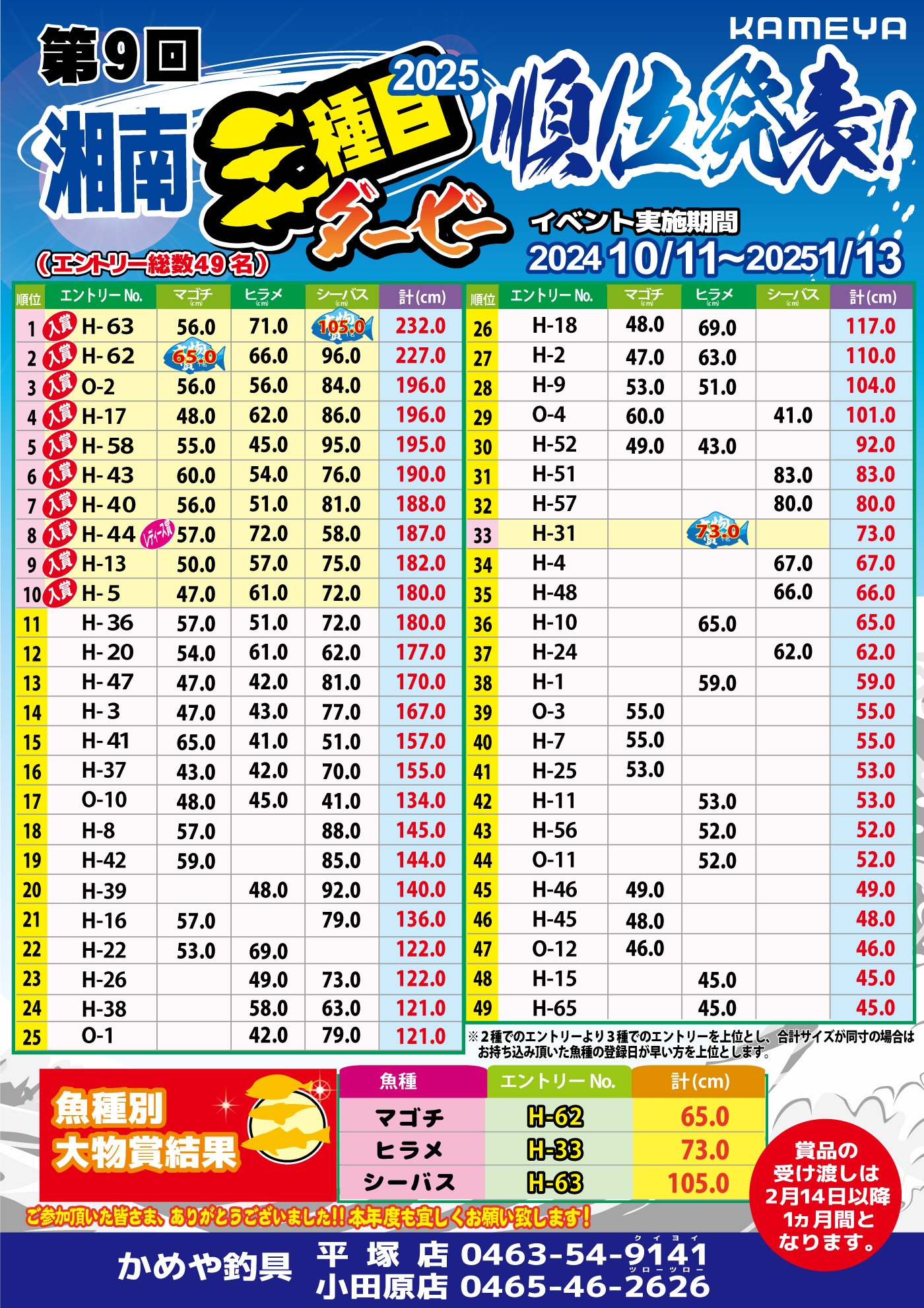 みなさんおはようございます かめや釣具平塚店です 第9回湘南3種目ダービー順位発表 景品のお渡しは2月14日〜3月14日までの1ヶ月間となっておりますので、予めご了承くださいませ。 今回も多くの方が、ご参加してくださいました!! 皆様ご参加ありがとうございました!!! #かめや釣具 #かめや釣具平塚店 #3種目ダービー #順位発表