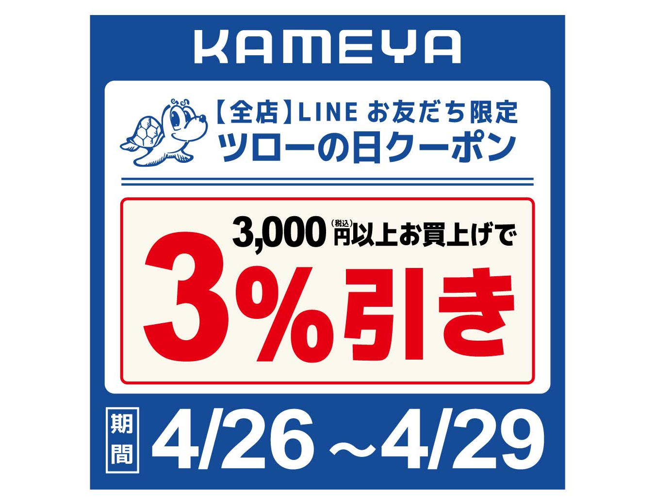 皆さんこんばんは!!かめや釣具平塚店です🐢本日より、かめや全店でLINEお友達限定ツローの日クーポンを配布中!!!3000円以上のお買い上げで3%引きされるクーポンとなっております。期間 4月26日(土)~4月29日(火)4日間限定での開催となります。この機会にぜひ当店でお買い求めください。皆様のご来店心よりお待ちしております🐟#かめや釣具 #かめや釣具平塚店 #LINEクーポン #ツローの日 #ツローの日はポイント2倍 #ツローの日クーポン