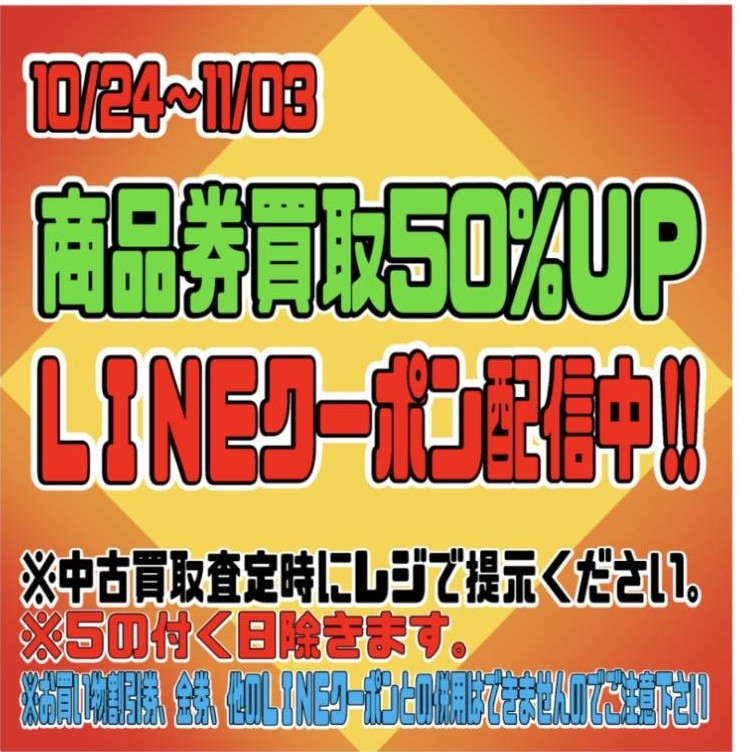 今現在、商品券中古買取50%UPクーポン配信中です(^^)/