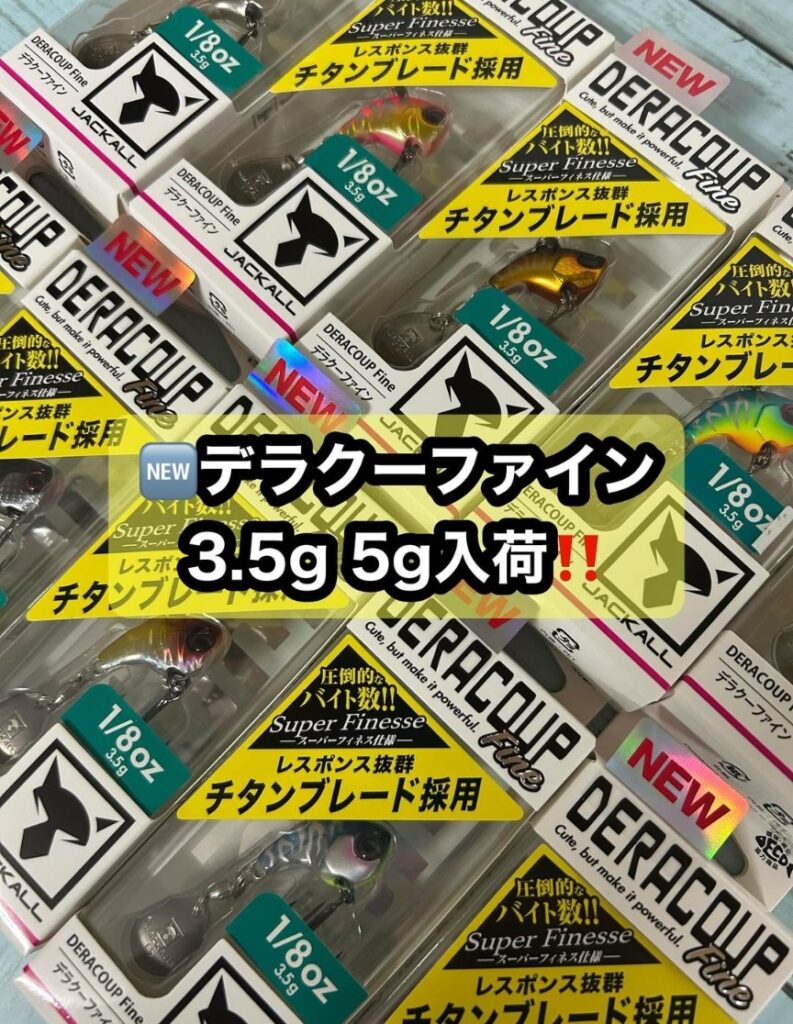 こんにちはかめや釣具大垣店です! 本日の入荷情報⭐️ 【ジャッカル】 🆕デラクーファイン3.5g 5g 秋の巻物シーズンの数釣りに最高な新製品入荷しました! 樹脂ボディを活かしたクリア系のカラーもラインナップ👍 デラクーファイン巻いてバスフィッシング楽しみましょう🎵