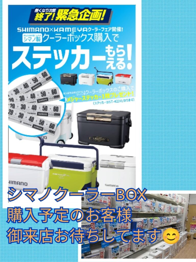 シマノ様のクーラーボックスを購入して頂いたお客様にシマノメジャーステッカーをプレゼント中です(#^.^#)