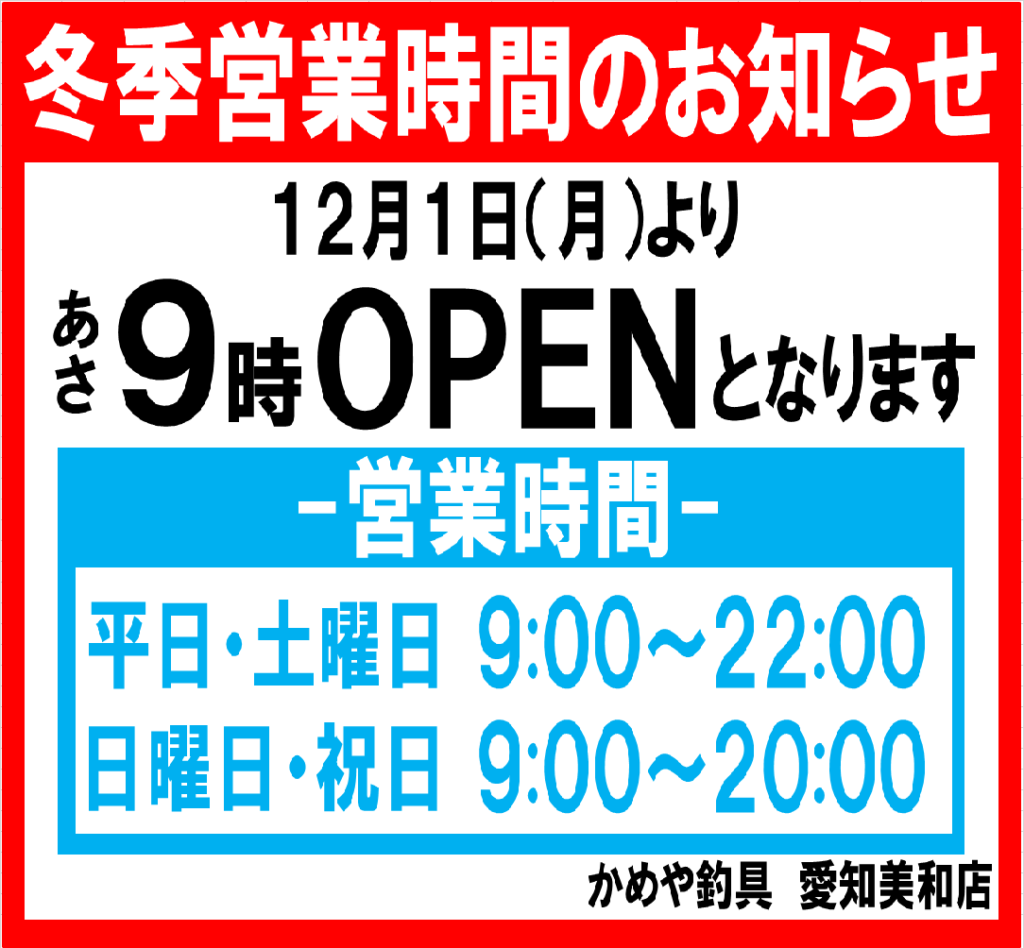 12月1日より朝9時オープンとなりますのでお間違えないようによろしくお願いしますm(__)m