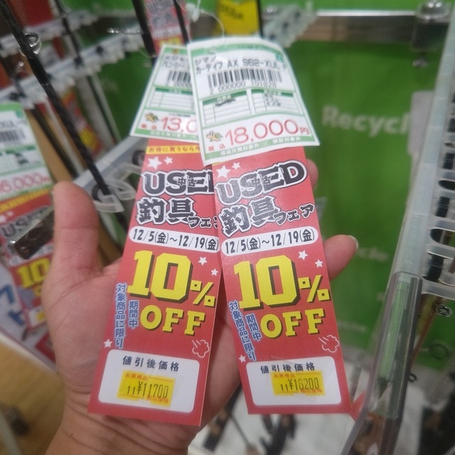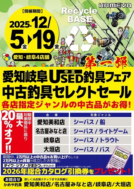 こんにちは!岐阜店松下です。 本日5日より19日まで、中古フェア開催です♪ 岐阜店はシーバスのジャンルと、トラウトのジャンルが対象です。USEDフェアPOPでズバリ表示してありますので、分かりやすいと思います(*^^)v  また、『期間中中古品2万円以上のお買い上げ』or『中古買取り2万円以上の成立』で2026年度の【ダイワorシマノorがまかつの総合カタログ】の引換券をプレゼント致します(^^♪  (ただし、配布カタログが無くなり次第終了ですので、ご注意ください) 是非この期間をお見逃しなく(^_-)-☆