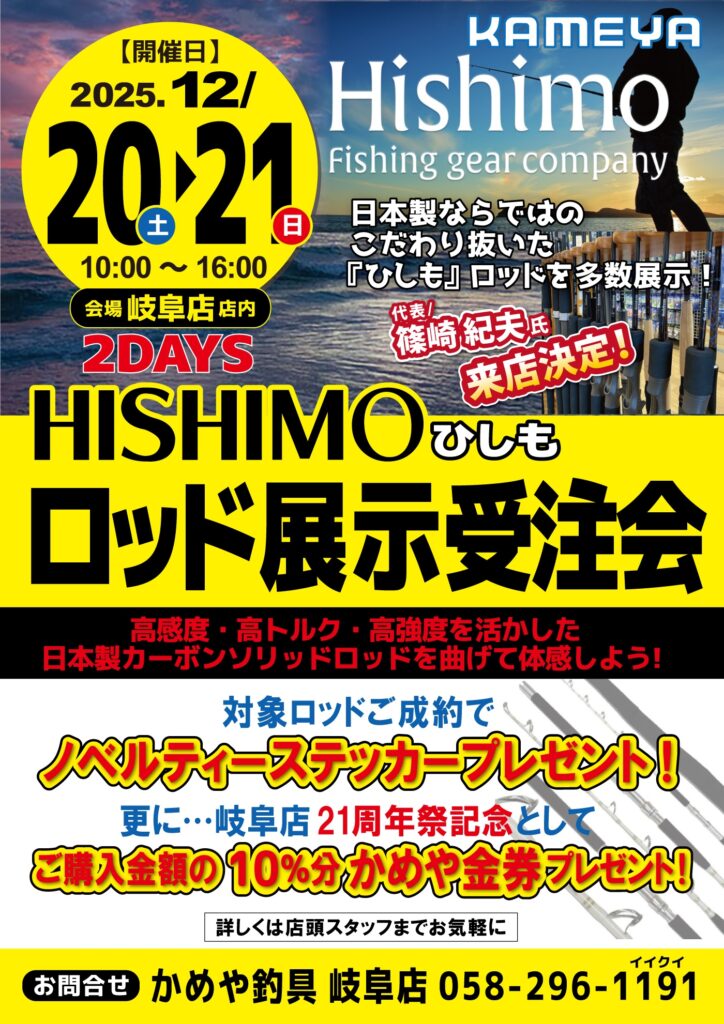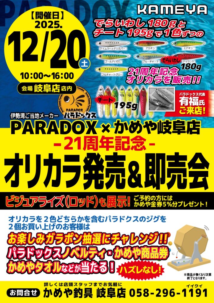 こんばんは!岐阜店松下です(^^♪  12/20(土)、12/21(日)の週末で、岐阜店21周年記念のジギングポップアップイベントを岐阜店内にて行います。20日(土)は、【パラドックス様】と【ヒシモロッド様】の2メーカー様合同にて(*^^)v 21日(日)は【ヒシモロッド様】にて行います♪♪ パラドックス様は代表である有福様ご来店!! ヒシモ様は代表である篠崎様にご来店頂きまして、店頭にて商品説明を行って頂く予定です(^-^)♪ 両日共に10時~16時でイベントを行って参ります!!  岐阜店21周年を記念してのイベントとなりますので、それぞれ普段ではなかなか無い特典を御用意しておりますので、是非この機会をお見逃しなくご参加をお願い致します(*^^)v