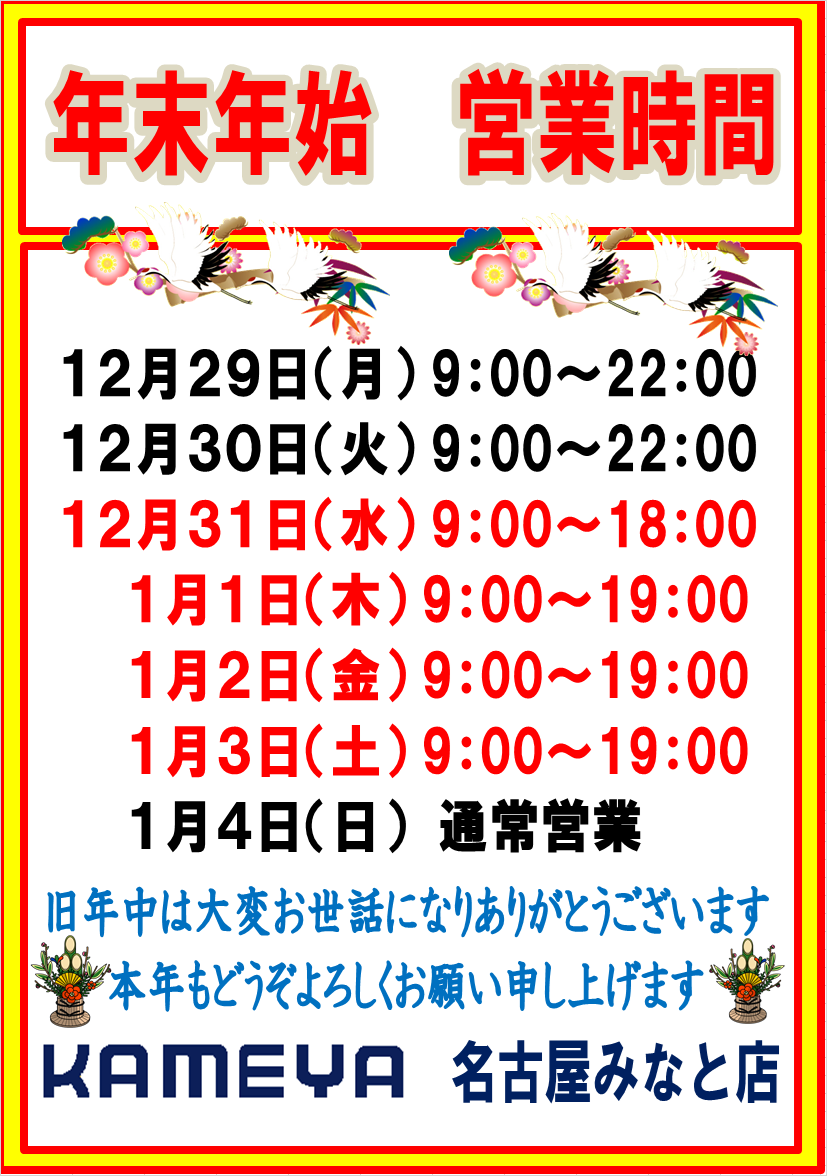 年末年始の営業時間につきまして、下記の通りご案内いたします。