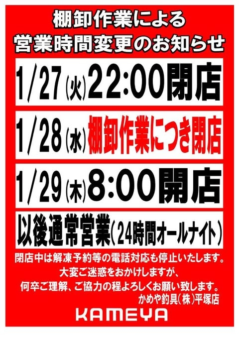 #かめや営業時間変更#かめや釣具#かめや釣具平塚店 #平塚#釣り 釣り情報 釣り道具 釣りスタグラム 釣り人応援 釣りボーイ 釣りガール 釣り大好き 釣り人の特権 釣り三昧 釣り好きと繋がりたい fishing 平塚釣り 相模川 平塚新港 大磯港 相模湾 釣り初心者 釣りしたい