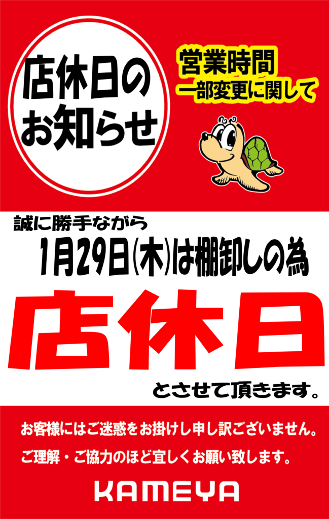 誠に勝手ながら1月29日木曜日は棚卸しの為店舗休業とさせていただきます。