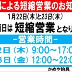 皆様こんにちは(‘◇’)ゞ短縮営業のお知らせです。本日22日(木)は17時閉店・明日23日(金)は12時開店とさせて頂きます。皆様にはご迷惑おかけしますが、お間違いの無い様、宜しくお願い致します。