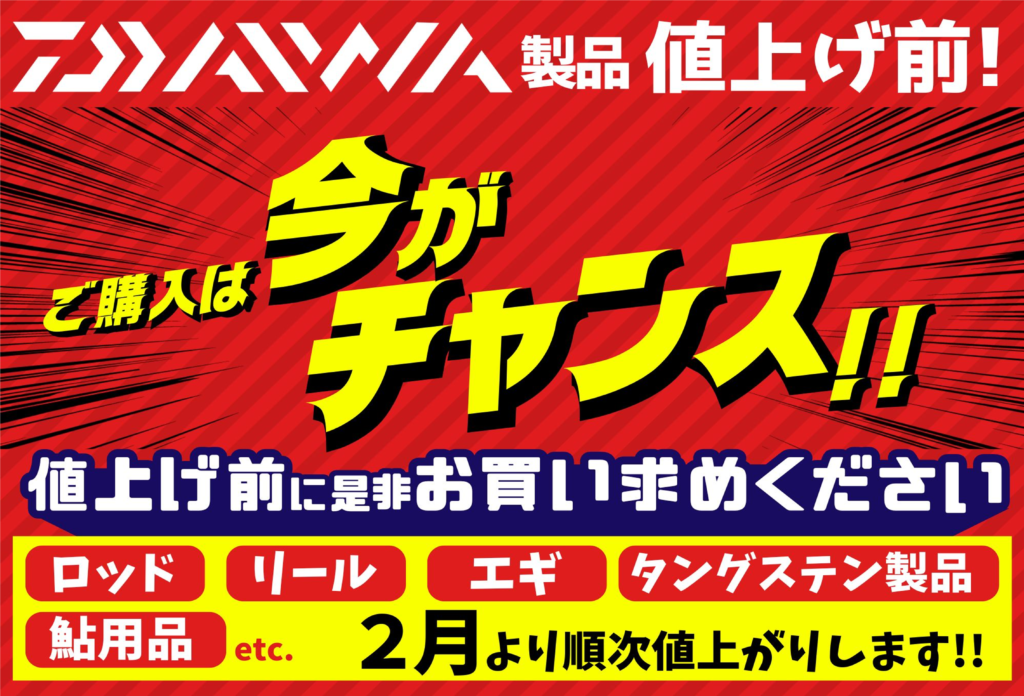 2月から各種メーカー様にてリール、ロッド、タングステン商品で値上げが予定されております!
