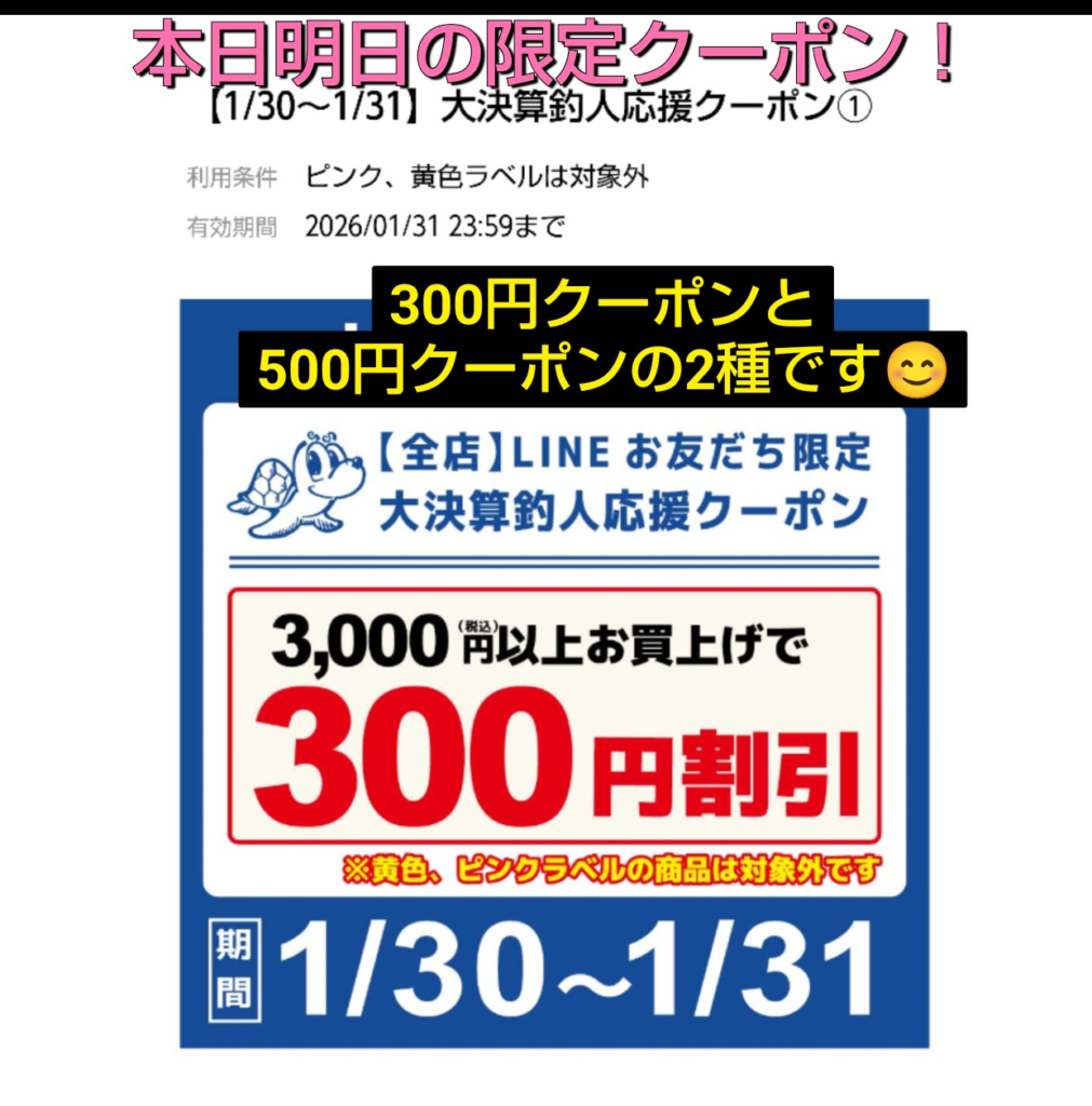 本日明日と、特別な【大決算LINEクーポン】をお届けしております。3000円以上のお買い上げ時に使える300円クーポンと、5000円以上のお買い上げ時に使える500円クーポンの2種となります。使用期限は短いですが、是非お使いにご来店をお願い致します♪♪