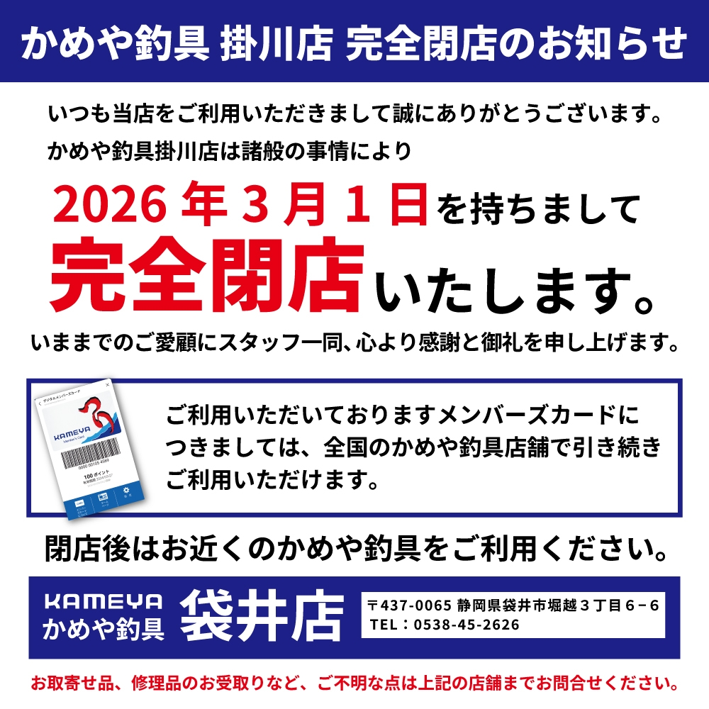 かめや釣具掛川店は諸般の事情により、2026年3月1日をもちまして完全閉店いたします。