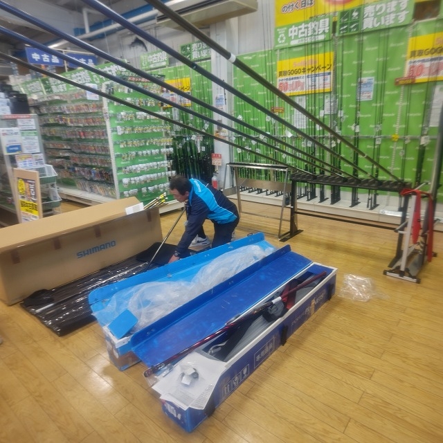 こんにちは~!岐阜店松下です(^-^) いよいよ今週末は、【鮎竿、鮎用品展示受注会】の開催です。1点変更がございますので、ご案内を致します。2/28(土)の有岡氏のご来店時間ですが、高知までの公共交通機関の時間の都合により、スタートを10時からと早めまして、終了を15時ぴったりとさせて頂きます。(11時半~12時半にて休憩を取って頂く予定となります)どうぞご理解の程宜しくお願い致します。そして、本日【ダイワ、シマノ】の展示竿が到着し、展示を開始致しました。(鋭意展示作業中♪) 本日、明日とゆっくりと竿を触れますので、是非いらしてみて下さい(^_-)-☆