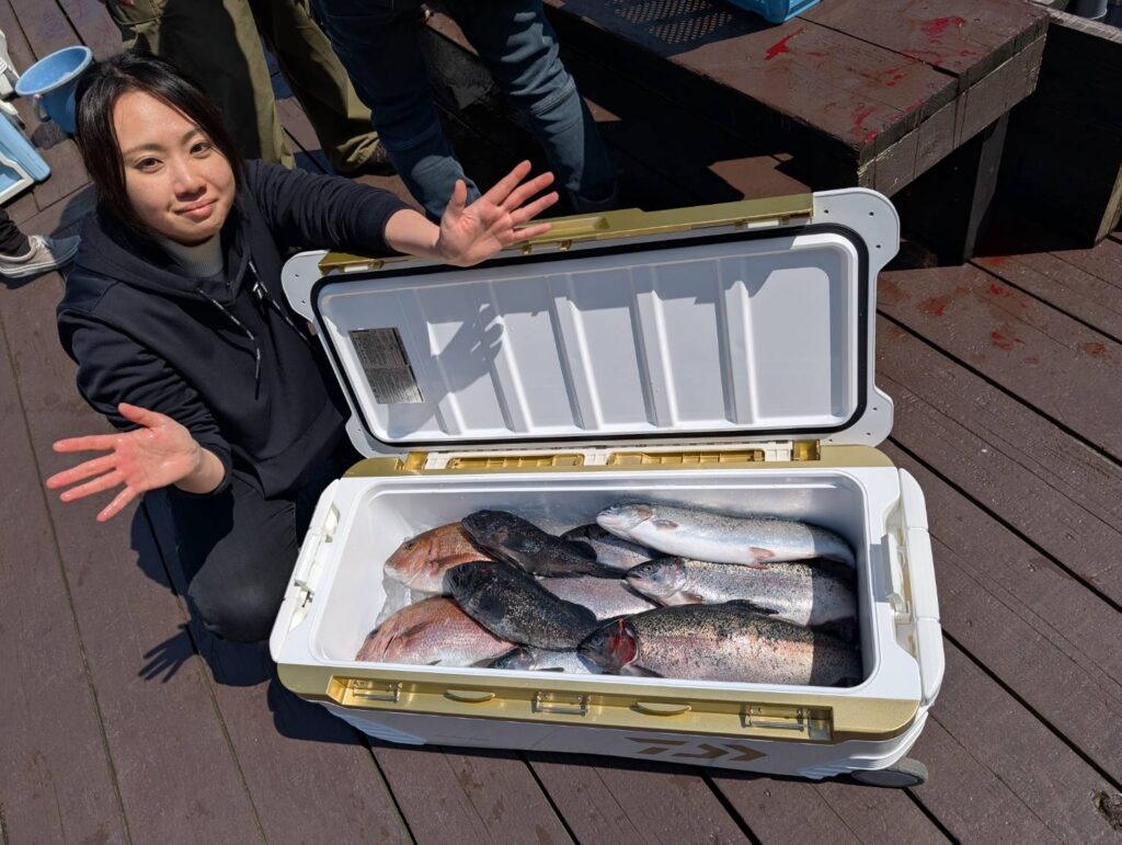 最終的にはトラウトサーモン6匹・クロソイ2匹・真鯛2匹で終了。2kg程の大型サーモンも入っており、引きがかなり強烈なので楽しいです。