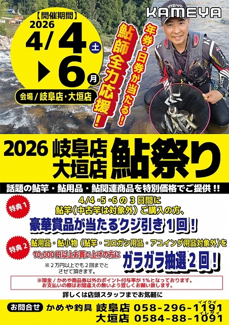 こんにちは!岐阜店店長松下です♪  4月4.5.6日は【岐阜店鮎祭】の開催です。今年は、4.5.6.日の3DAYにてポイント2倍となっております! 鮎竿、鮎用品、鮎小物が特別価格で販売です(*^^)v 【ガラガラ抽選やクジ引き】あり!!  鮎釣りをされる方は勿論、通常のご利用者様にも【ポイント2倍】は適用されておりますので、是非今週末はかめや岐阜店をご利用下さいませ(^^♪
