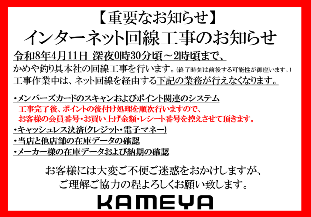 令和8年4月11日深夜0時~2時ごろまでかめや釣具本社のインターネット回線工事を行います。