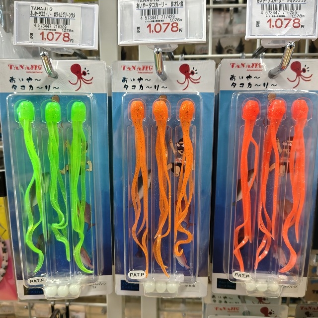 こんにちは!あいやータコカーリー【AZUカラー】の入荷です(*^^)v そして、つうじゅおカラーのタコカーリ―のチャート、オレンジ系カラーも補充致しました♪ もう1点!!がまかつのかんたんスイベル用のでっかいカーリーも入荷♪です。このがまかつのかんたんスイベルを使用すれば、どんなメーカーのネクタイも自由自在に組み合わせ可能です(^^♪ 桜鯛の本格的なシーズンです!是非岐阜店をご利用下さいませ(^_-)-☆