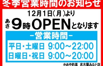 【冬季営業時間のお知らせ】 名古屋みなと店