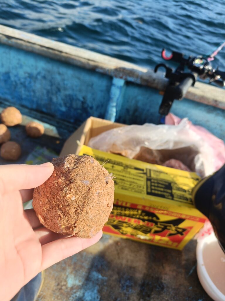 泳がせの合間にはカワハギを狙い、アサリやエビを細かくし、集魚液に漬けた特製エサでさそいます。