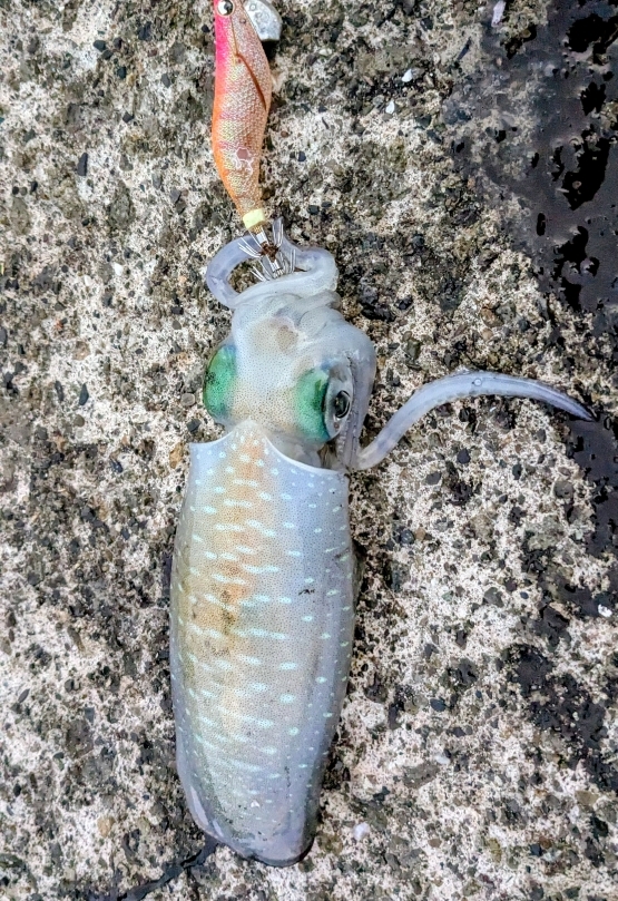 スタッフ釣果です。西湘エリアの堤防で小型ながらアオリイカがエギングで釣れました。