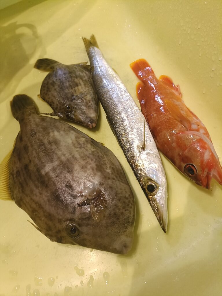 全体的に渋めではあったものの…30cm近い大きなカワハギを筆頭に、アジ、アカハタ、カマス、シイラ、ベラなどなど…お持ち帰りには十分すぎるごちそうを確保できました!