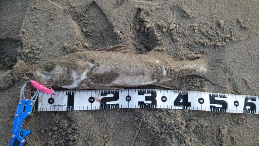 遠投後、底を取ってからのただ巻きで手前30mくらいの場所で食ってきたとの事。近くでヒラメを釣られていた方も居たそうです。