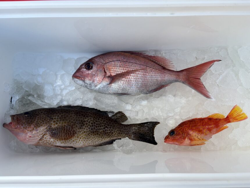 タイラバでの釣果となります。時化で生憎の海況でしたがマダイ、根魚の反応が良く40cm台のマダイや良型のオオモンハタが釣れたようです。他にも50cm台のマダイが複数釣れていたようです。