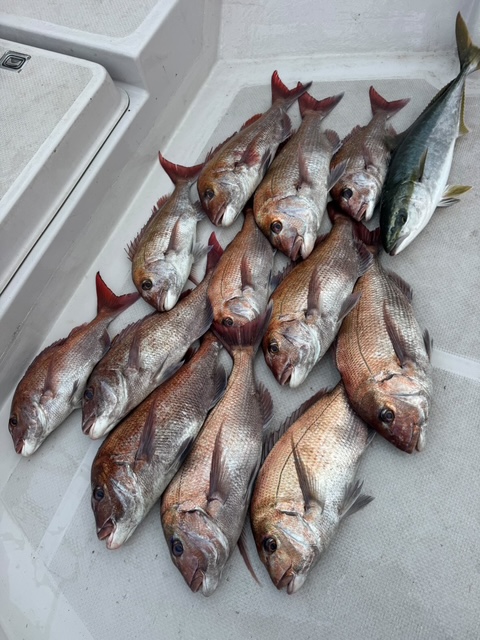 その後も48cm~59cmまでの真鯛を4枚追加。さらにホウボウも複数釣り上げ、大満足の竿納めとなりました。船中では真鯛12枚に加え、青物もヒットし、終始大盛り上がりの釣行に!