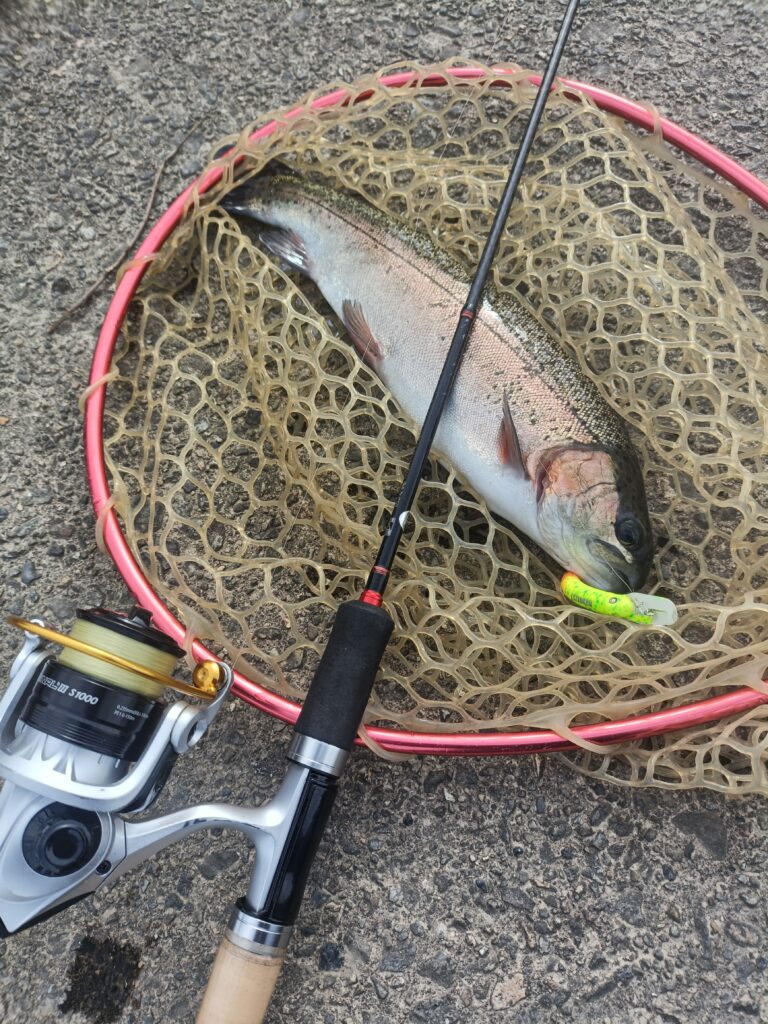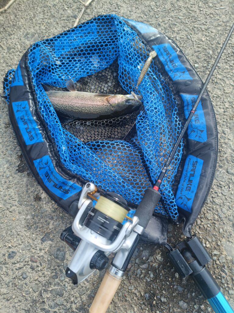 普段このトラウト場では1.0g以下の軽めスプーンが主力ですが、こんな日は1.2〜1.5gくらいの少し重めがあると安心。