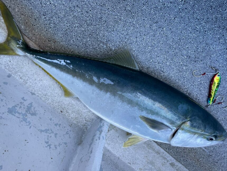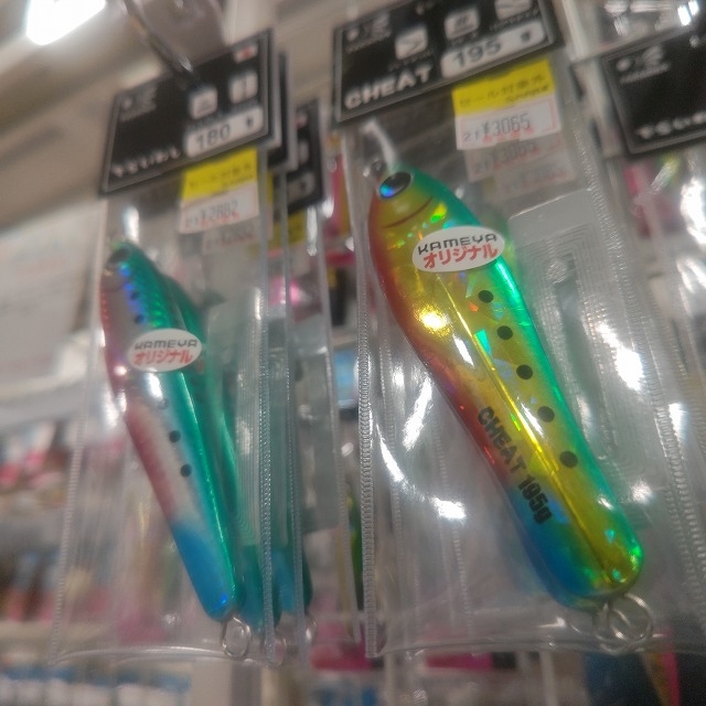 お客様より、かめや岐阜店オリカラのチート195gでの釣果を頂きました♪ 8kgを超える鰤と、真鯛です。パラドックスの岐阜店オリカラチート(ゴールド本気イワシ、チートですがイワシをイメージしたドッド模様、テールにブルー夜光、全体へケイムラ塗装を施してあります) 岐阜店オリカラを使用しての素晴らしい釣果ありがとうございます(*^^)v