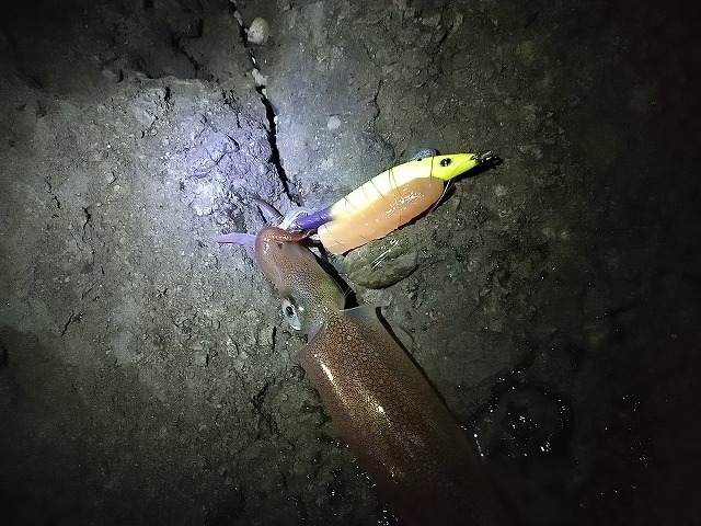 寒波前の釣果です。6日の夕方19時~22時の3時間で、越前の地磯ヤリイカエギングに、胴23cm25cmの2杯の釣果だったそうです。邪道エギに塩ササミを巻き付けてのエギングです。