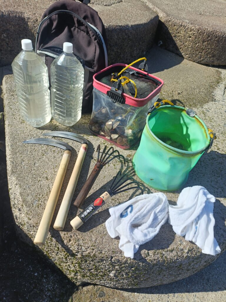 🧺持ち物・熊手・カマ・バケツ・タオル・リュック・空のペットボトル(海水持ち帰り用)・お財布