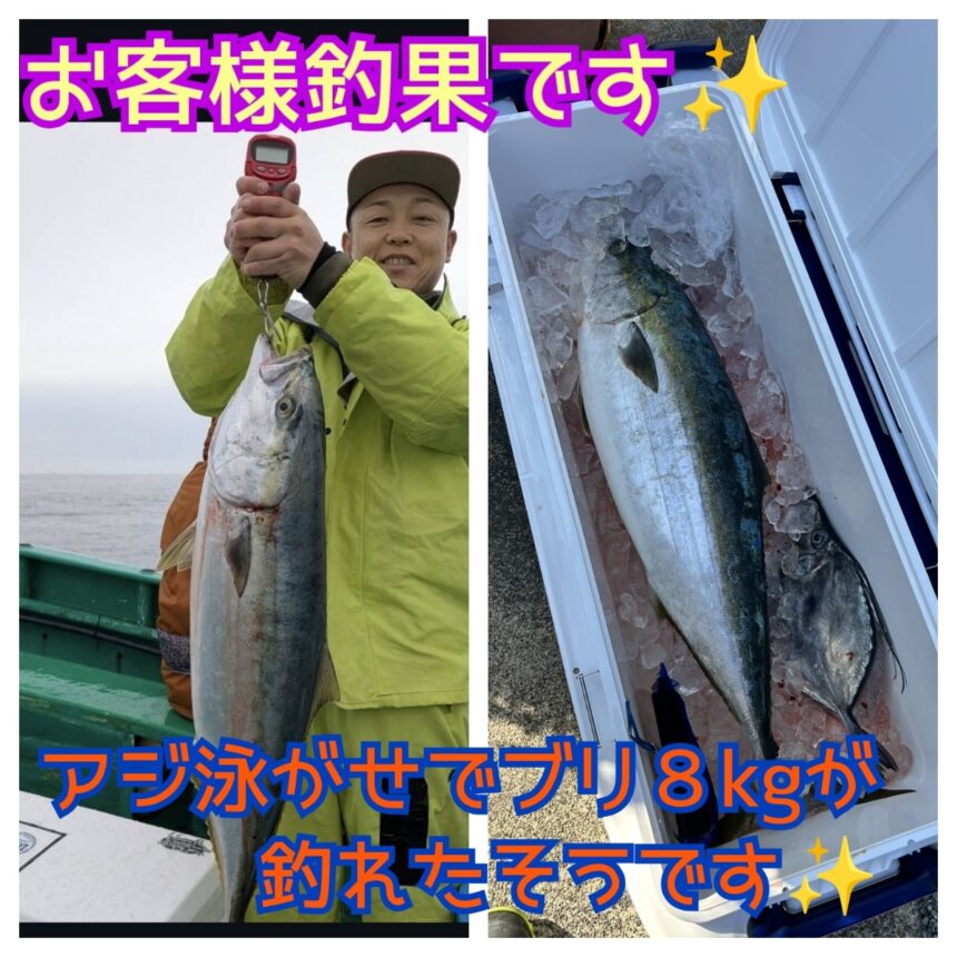 お客様釣果です。平塚沖にてブリ8kgが釣れたそうです。