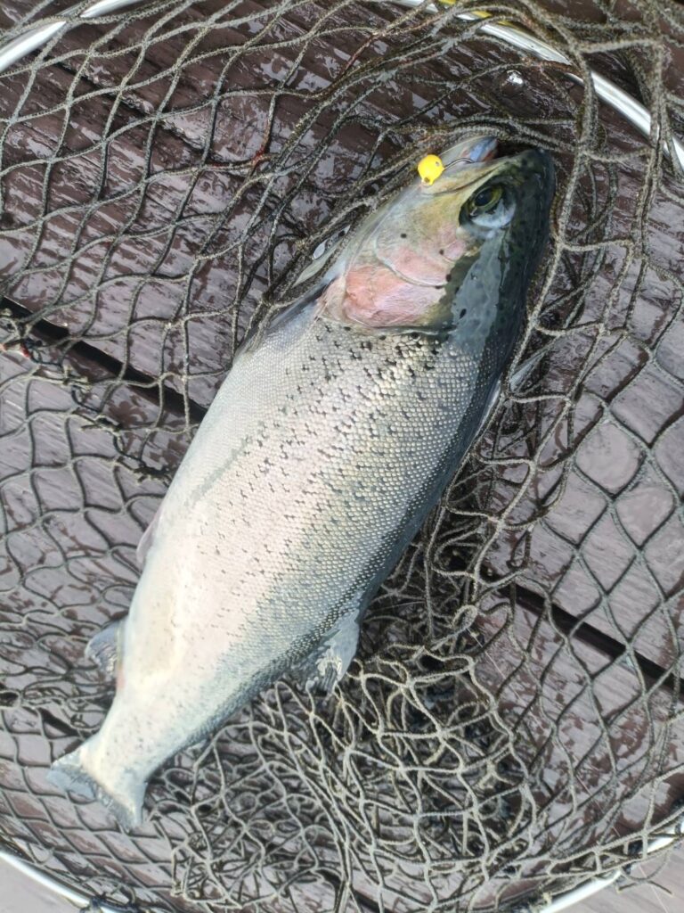 当日は真鯛、虹鱒ともに黄色系への反応が良く、黄色のジグヘッドが特に有効でした
