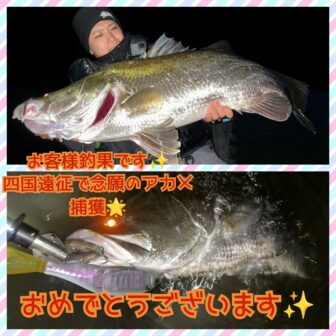 お客様より釣果情報を頂きました。四国遠征に念願のアカメを狙いに行くと聞いておりましたが、見事念願のアカメを釣る事ができたそうです。遠征釣り・夢のあ…