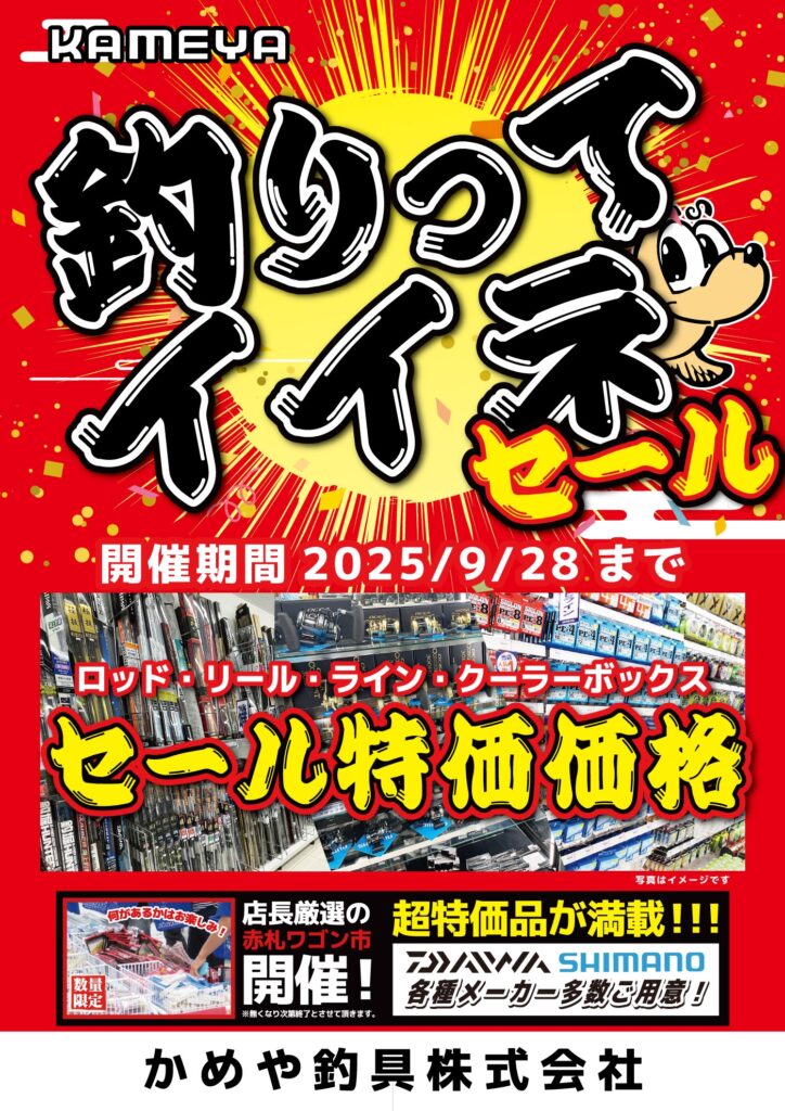 有名メーカーロッド、リールやクーラーボックスがお求め易いのも明日9月28日が最終日!!