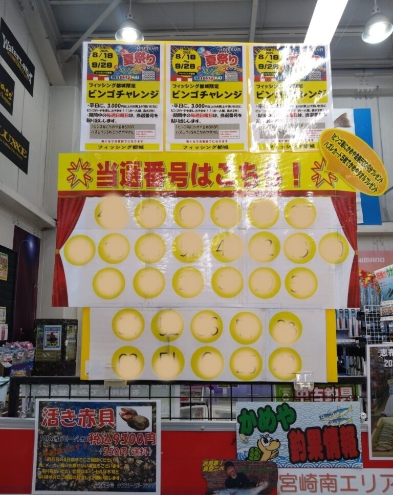 ・・・という事で、フィッシング都城ではビンゴチャレンジ当選番号発表しています!!