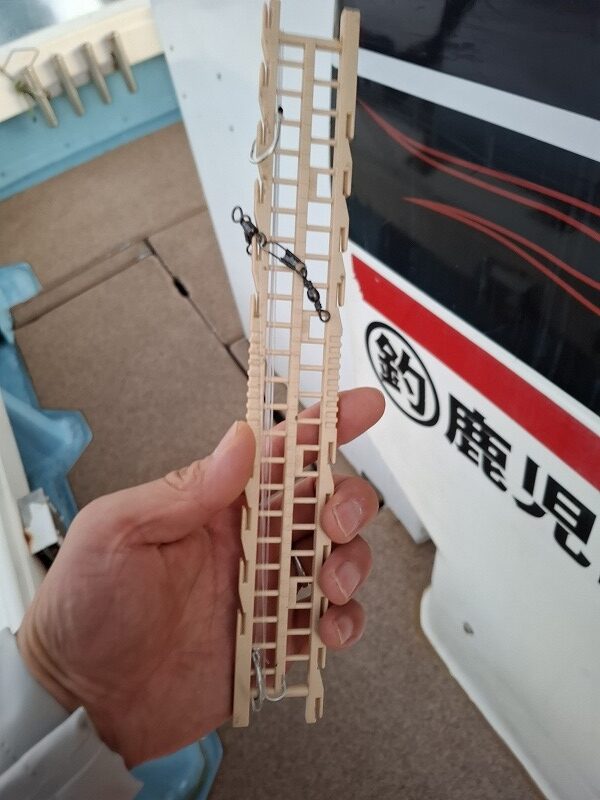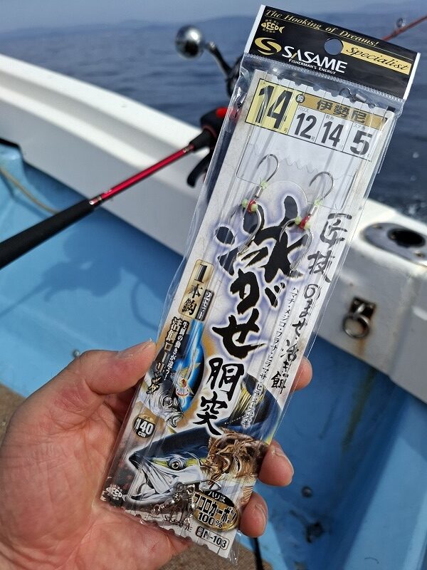 仕掛けはササメ社の「泳がせ胴付き」を使用。オモリは50号です。