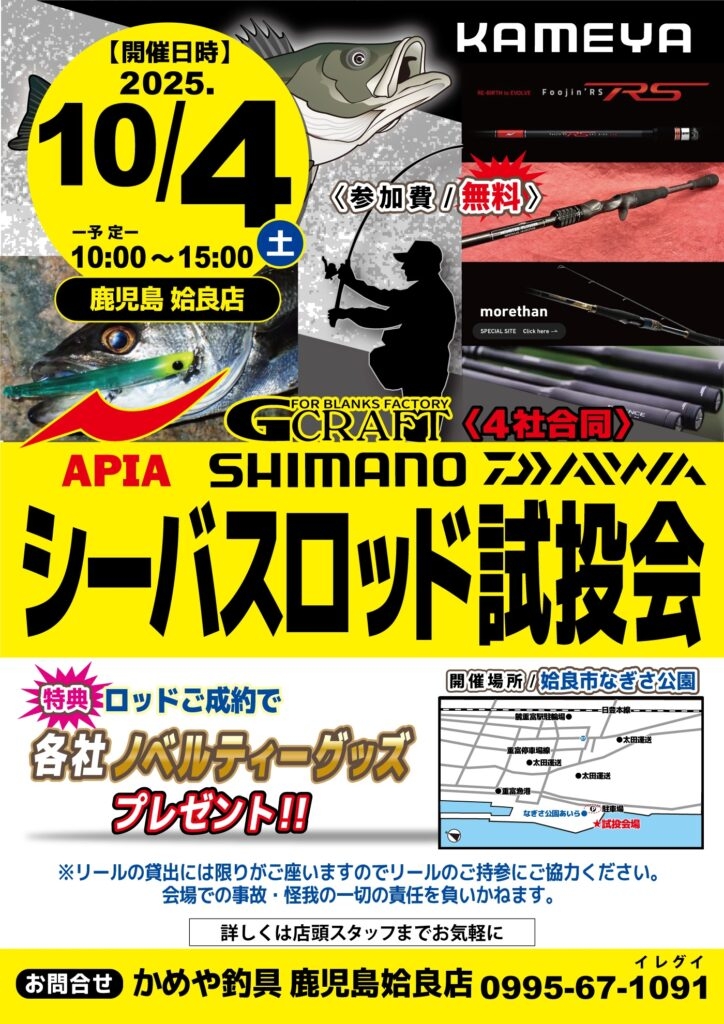 【イベント】いよいよ明日10/4(土)は4社合同シーバスロッド試投会in姶良なぎさ公園!鹿児島姶良店