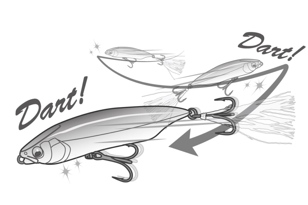 ジャーク時には、リップレス・ジャークベイトと呼べるほどの左右へのロングダート性能を発揮。