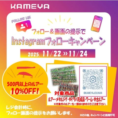 レジにて当店のインスタグラムフォロー画面を提示いただくと500円以上のルアーが10%オフとなります