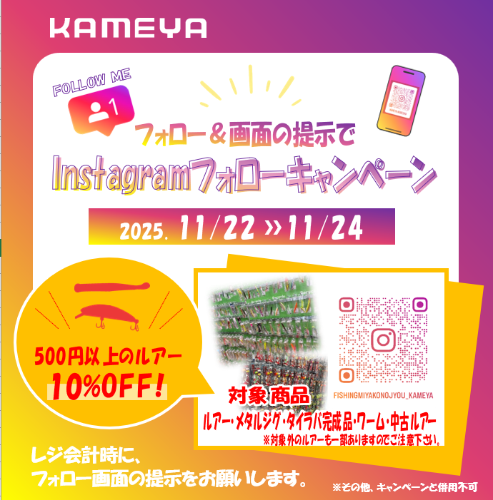 レジ会計の際に都城店のフォロー画面を提示頂ければ、10%OFF致します!!