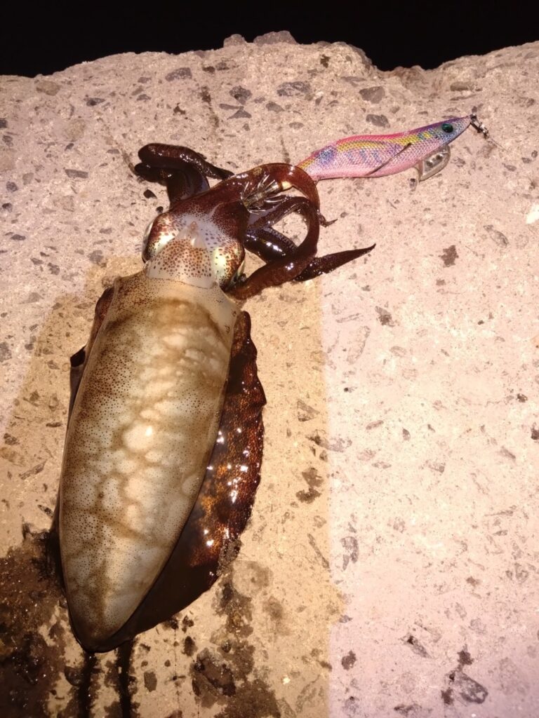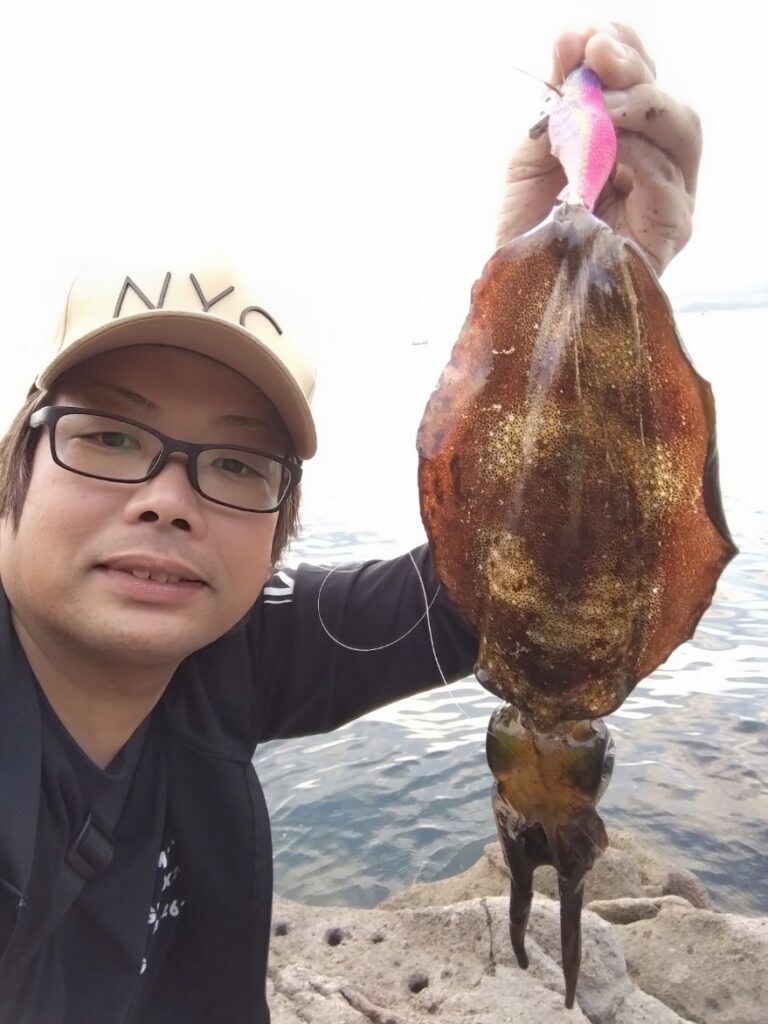 ケイムラカラーのエギに反応がよく、イカパンチも数回ありました。