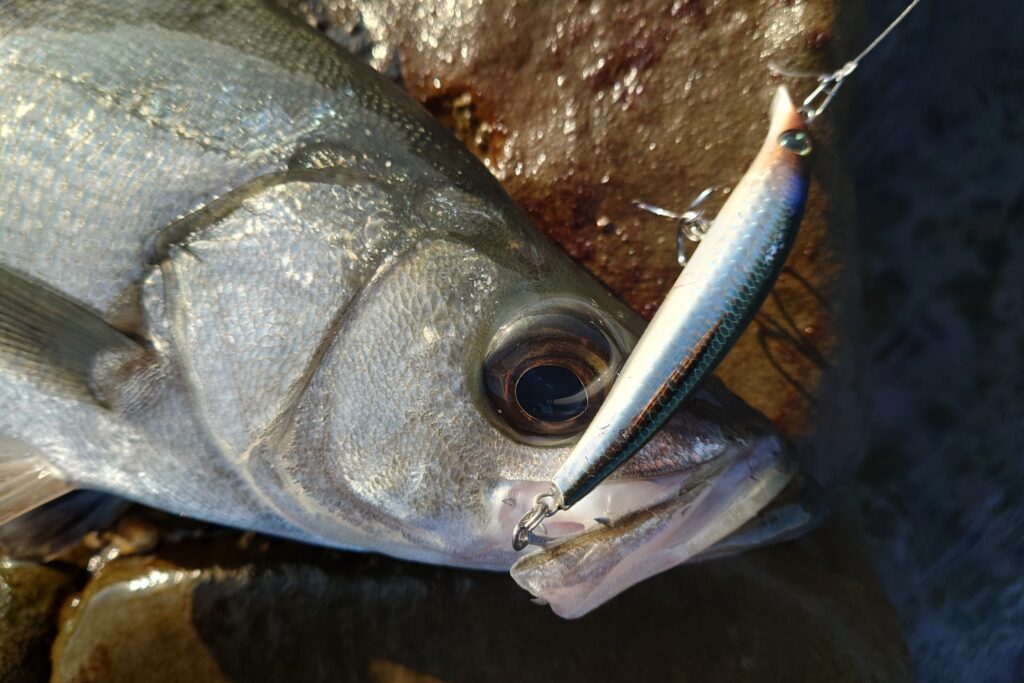 小型のミノーをキャストして引き波の中をゆっくりトレースしてみると、、、